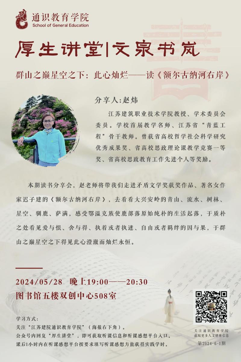 本期读书分享会,赵老师将带我们走进茅盾文学奖获奖作品、著名女作家迟子建的《额尔古纳河右岸》,去看看大兴安岭的青山、流水、树林、星空、驯鹿、萨满,感受鄂温克族使鹿部落原始纯朴的生活起落,于质朴之处看见爱与恨、舍与得、执着或者执迷、自由或者羁绊的因与果,于群山之巅星空之下得见此心澄澈而灿烂永恒。